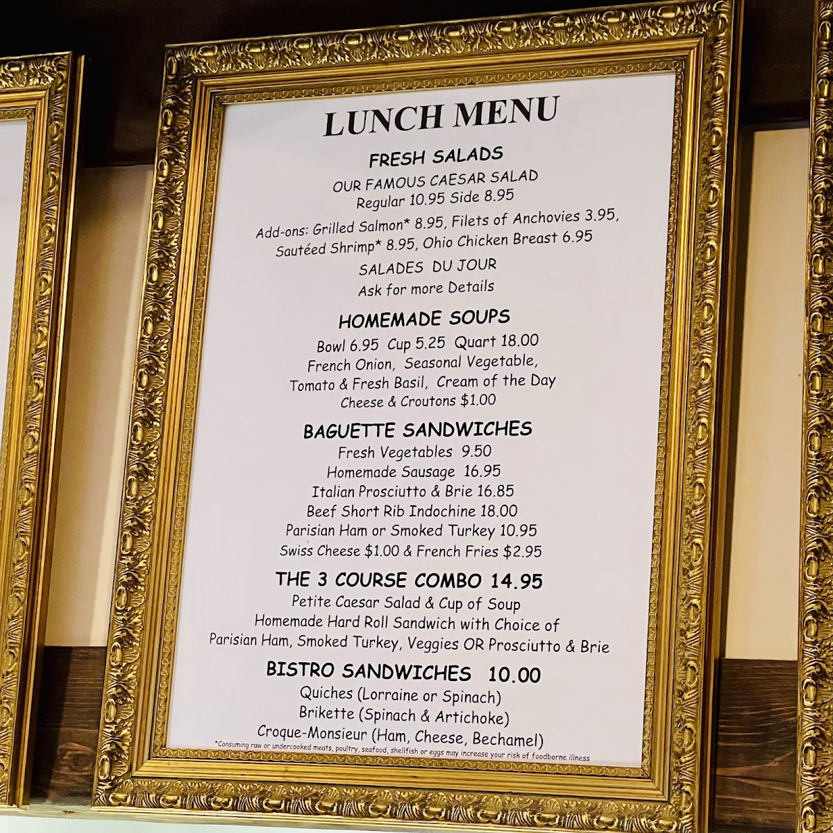 Petite Caesar salad, cup of soup (cream of tomato basil or French onion), and a hard roll sandwich. Choice of turkey, Parisian ham, prosciutto and brie, or fresh veggie. Sandwich has butter and dressing.